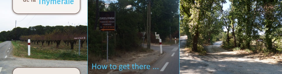 At the roundabout on the D543 on the route to Rognes, travel towards the village for 800m and continue on the D543, following signs for La Roque d’Antheron/Cadenet. After 2.8 km, take left turn into le Chemin de la Mignarde. Carry on for 300m. On your left, follow the sign "Écurie de la Thymeraie". You have reached your destination.